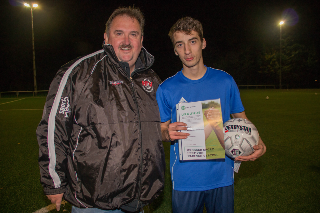 Für sein sportliches Verhalten wurde Jan Rieken mit einer Fair-Play Urkunde und Sachpreisen vom stellvertretenden Kreisvorsitzenden Andreas Schumacher ausgezeichnet.